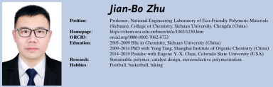 16. Zhang, W.; Shan, S.-Y.; Dai, J.; Cai, Z.; Zhu, J.-B. Well-Controlled Organocatalytic Ring-Opening Polymerization of Seven-Membered Cyclic Carbonates with Cyclohexyl Fusion. Chem. Res. Chin. Univ. 2024, 40, 856–862. (Invited contribution to the special issue on 20th anniversary of the Department of Chemistry at Renmin University of China)