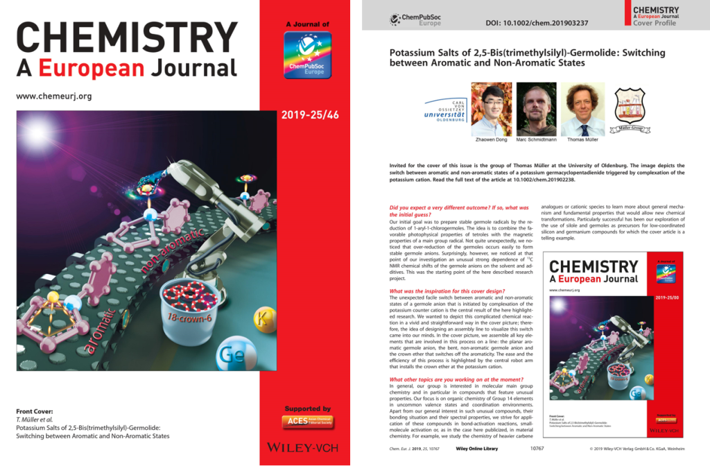 14. Zhaowen Dong, Marc Schmidtmann, Thomas Müller*, Potassium Salts of 2,5‐Bis(trimethylsily l)‐Germolide: Switching between Aromatic and Non‐Aromatic States, Chem. Eur. J. 2019, 25, 10858−10865. (selected as hot paper and featured on the front cover)