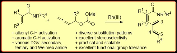 144.H. Wang, B. Beiring, D.-G. Yu, K. Collins, F. Glorius, [3]Dendralene Synthesis: Rhodium(III)-Catalyzed Alkenyl C–H Activation and Coupling Reaction with Allenyl Carbinol Carbonate, Angew. Chem. Int. Ed. 2013, 52, 12430.