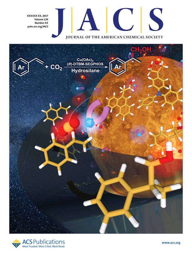 109.Y.-Y. Gui,† N. Hu,† X.-W. Chen, L.-L. Liao, T. Ju, J.-H. Ye, Z. Zhang, J. Li, D.-G. Yu*, Highly Regio- and Enantioselective Copper-Catalyzed Reductive Hydroxymethylation of Styrenes and 1,3-Dienes with CO2. J. Am. Chem. Soc. 2017, 139, 17011. († Equal contribution. Cover. Top 4 most read JACS papers in November, 2017. Highlighted by Synfacts 2018, 14, 0177, CJOC, X-MOL, OPR&D and Organic Chemistry Portal)
