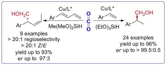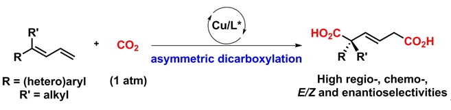 25.Y.-Y. Gui,*,† X.-W. Chen,† X.-Y. Mo, J.-P. Yue, R. Yuan, Y. Liu, L.-L. Liao, J.-H. Ye, D.-G. Yu*, Cu-Catalyzed Asymmetric Dicarboxylation of 1,3-Dienes with CO2. J. Am. Chem. Soc. 2024, 146, 2919–2927. († Equal contribution. Highlighted by Organic Chemistry Portal)