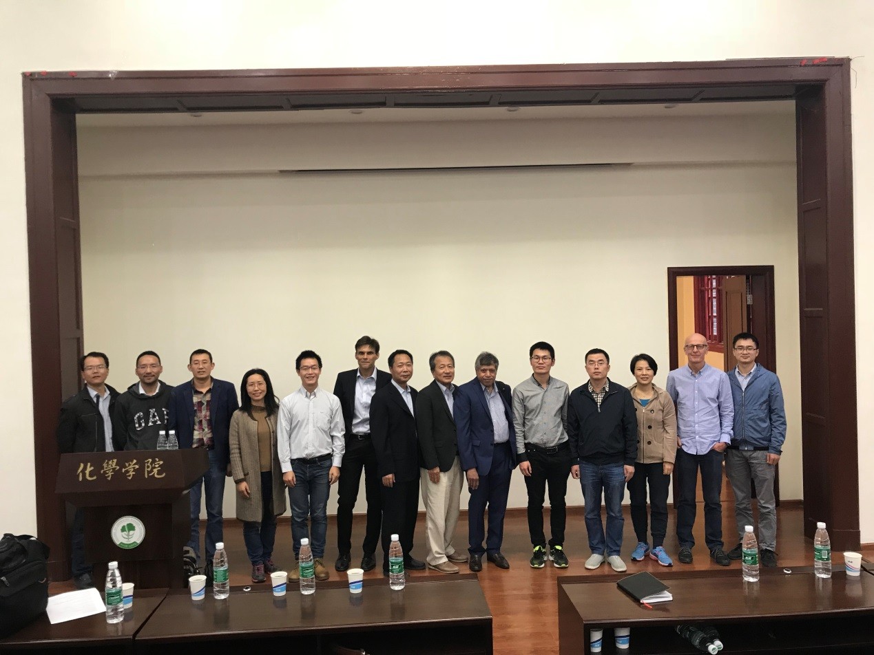 在研讨会中,五位专家分别对他们在自由基化学领域所做的杰出工作和心得体会进行了精彩的展示。其中,李超忠研究员介绍了烷基自由基氟化和三氟甲基化反应的研究进展;Mukund P. Sibi教授介绍了非手性模块调控化学反应选择性的研究进展;Ilhyong Ryu教授介绍了基于自由基的C(sp3)-H区域选择性官能团化的研究进展;Philippe Renaud教授介绍了自由基反应在合成化学中的应用及合成生物碱和其他生物活性化合物的方法;Armido Studer教授介绍了氮自由基领域近年来的研究进展。五场报告内容丰富,专家们讲解形象生动,深入浅出,使师生获益匪浅。在随后的自由提问环节,在座师生与专家们进行了热烈而深入地讨论交流。报告在热烈的掌声中落下帷幕,结束后部分老师与专家们合影留念。