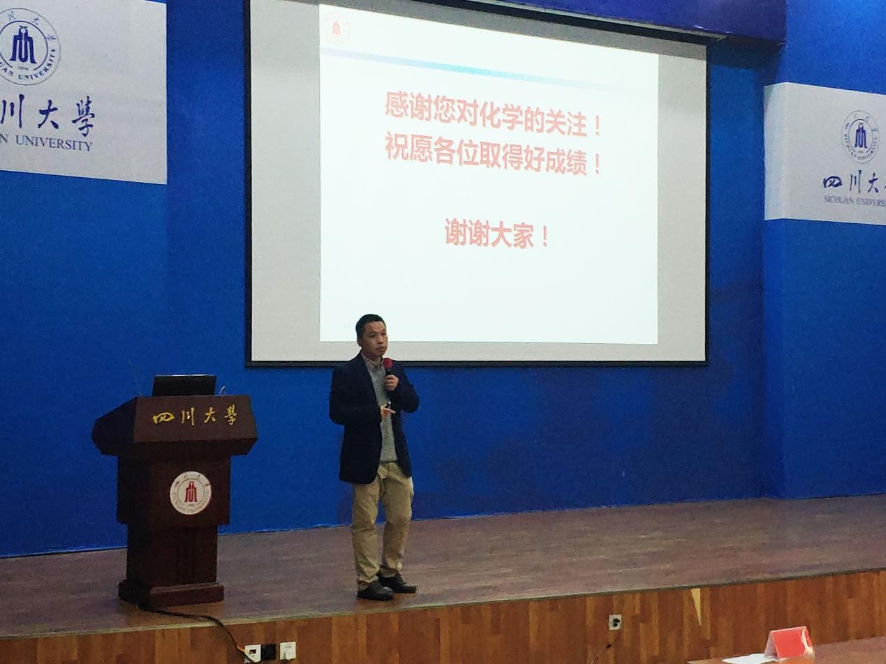 2018年10月13日上午,四川大学第五届“宏坤?银杏杯”化学在知识竞赛初赛成功举行。本次初赛包括讲座和笔试两个部分。英国正版365官方网站副院长郑成斌教授在江安水上报告厅为参赛同学们带来了“化学,让世界更美好”的专题讲座。我院2017级辅导员杨琴老师、2018级辅导员张若一老师参加了此次讲座。