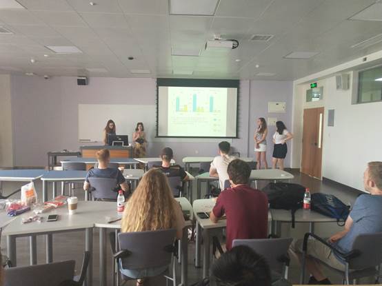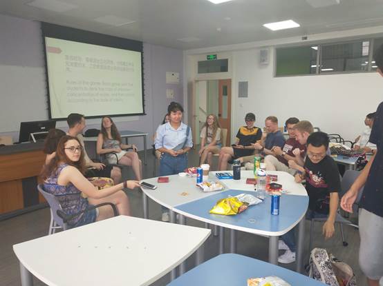 首先主持人简单介绍了本次水质调查活动的开展情况。随后,由来自英国约克大学的四名留学生对两天实验得到的检测结果进行了详细的讲解和阐述,并提出了对实验的一些建议。接着,各小组一起玩“你写我猜”、“抢凳子”、“狼人杀”等游戏。最后,大家围坐在一起,互相交流这两周的感悟,表达了自己的不舍之情。