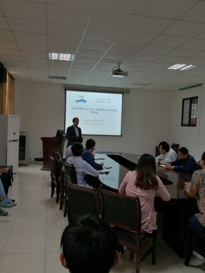 2018年9月13日,应英国正版365官方网站邀请,台湾中山大学吴明忠教授访问我院并做了题为“开发有机新合成方法——从挑战和意外中学习新事物”的学术报告,报告中吴明忠教授详细讲述了所领导的课题组发展的三类化合物的合成研究,包括呋喃萘醌类化合物、吡唑并[1,5-C]吡啶类化合物、3-酰基苯并噻吩类化合物的合成。