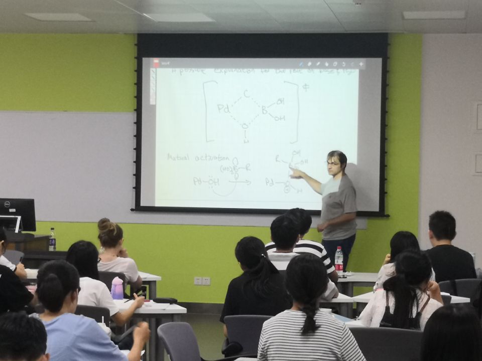 在课堂上,Mohr教授为同学们讲解了过渡金属在有机合成中的发展历史,介绍了近年过渡金属催化的研究热点,并对一些过渡金属(Pd,Cu,Ni)催化的机理进行了详细的介绍。在后面的讲课过程中,Mohr教授设置了文献讨论环节让同学们进行讨论,并且每节课上都会主动与同学们进行互动交流。课程结束时,同学们感谢Mohr教授的精彩讲课,并与教授交流了学习方式及科研方法。