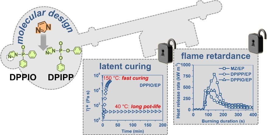 传统的双组份环氧树脂-固化剂体系存在储存、施工等实际难题;而环氧树脂固有的易燃等缺陷也限制了材料的广泛应用。王玉忠教授课题组针对这一瓶颈问题,该研究报道了两种含磷咪唑1-取代物用做阻燃潜伏环氧固化剂,其中含磷基团在钝化咪唑对环氧基团过高反应性赋予其潜伏固化效果的同时,又“一石二鸟”地赋予固化物以良好的本征阻燃性能,由此成功地解决了现有环氧树脂“潜伏固化效果”和“良好阻燃性能”不能同时具备的难题;同时该文章也阐明了固化剂的结构与其潜伏固化行为及其固化物性能间的“构效关系”以及阻燃固化剂的阻燃机制,为更多高性能环氧固化剂的设计合成提供了新思路。