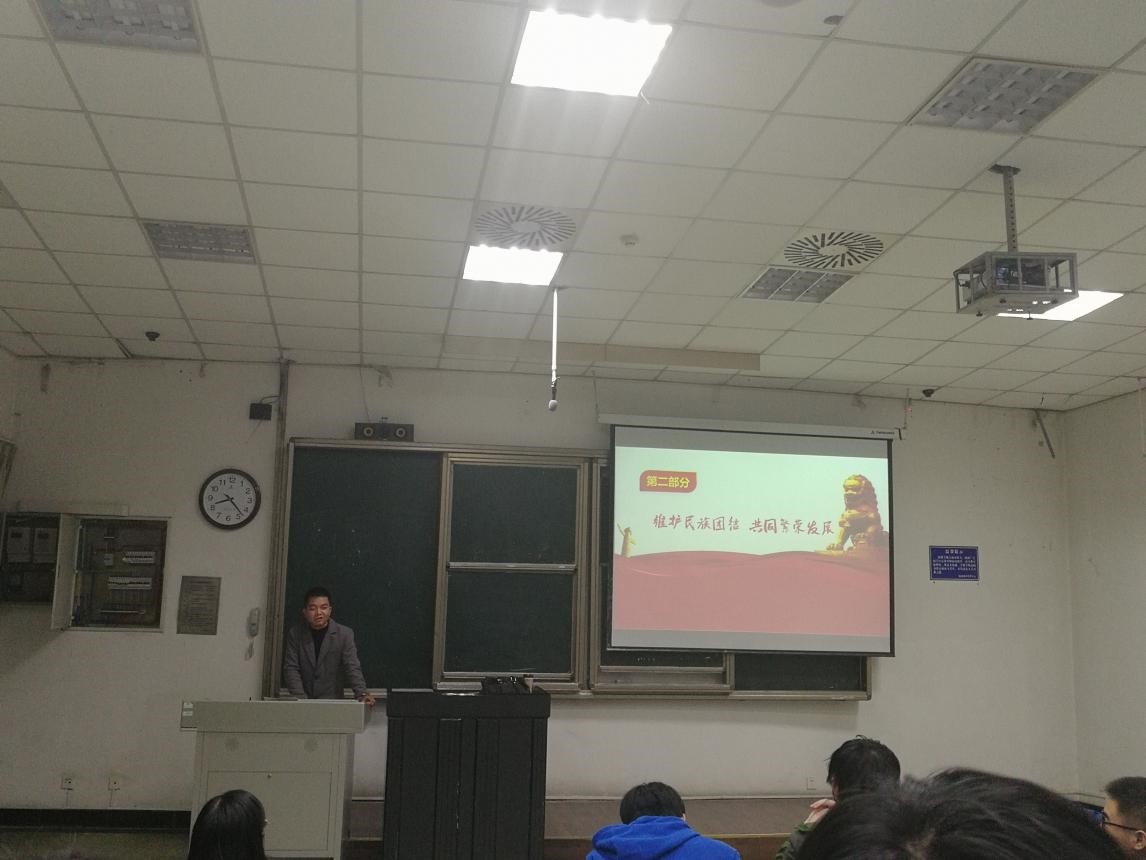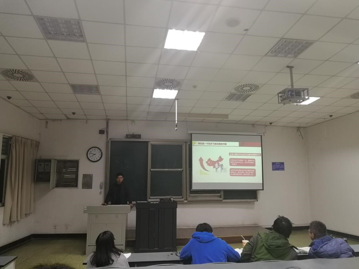 李珍焱老师介绍了本次活动的主要情况和主讲同学情况后,宣讲活动正式开始。首先是叶昌杰同学进行宣讲。他从当前大家关注的一些时事切入,阐释了习总书记关于我国社会主要矛盾已经转化为人民日益增长的美好生活需要和不平衡不充分的发展之间的矛盾这一论述,接着以“现在是一个怎样的中国,中国是一个怎样的未来”为题进行宣讲,其宣讲围绕中国的“五位一体”发展现状展开,通过丰富的例子向同学们展示了一幅创新驱动、经济腾飞、依法治国、绿色生态、兵强马壮、大国形象和弊绝风清的中国新图景,并且描述了中国代表的是一个崭新的未来,一个民主的、合作共赢的、清正廉洁的未来。之后,纪杰杰同学以“不忘初心跟党走,奋勇建功新时代”为题,向同学们进行了宣讲。他结合自己在甘阿凉地区做志愿者的经历,分享了他所见证的民族地区教育、经济等的变化,党和国家在维护民族团结,共同繁荣发展方面的努力和成效。他一直以来坚持在甘阿凉地区做志愿者的经历和精神也深深地感动了在场的师生。