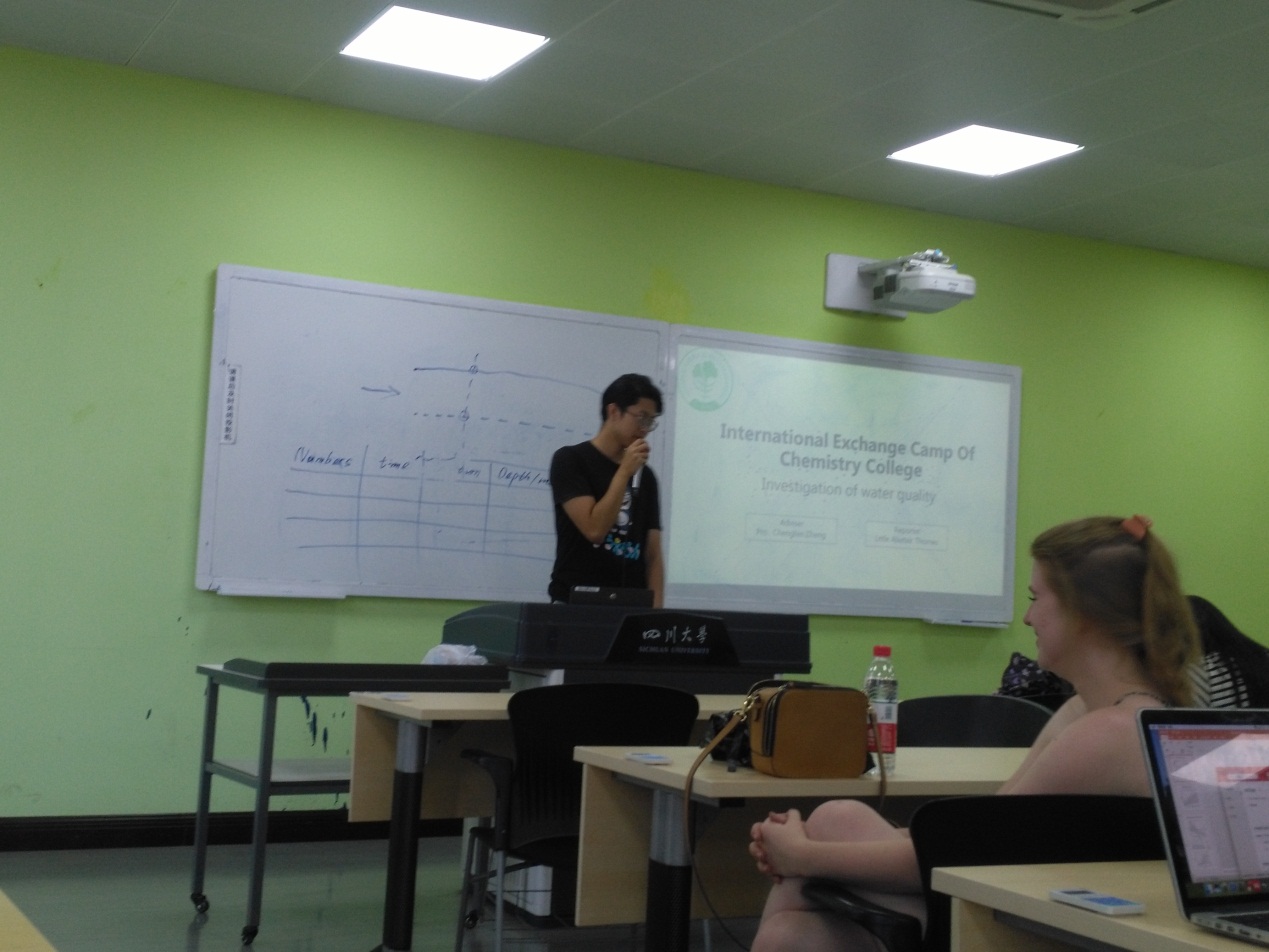 首先主持人简单介绍了我院本次水质调查活动的开展情况。随后,五个小组从污染物的危害、现状,检测方法,预防和治理等方面分别对“水中的银”,“水中的有机碳”,“水中的汞等重金属”,“水中的铬”,“水中的COD与阴阳离子”进行了详细的讲解和阐述。接着,各小组进行风采展示和欢送茶话交流会。大家纷纷上台表演节目并且发言表达自己参加本次活动的感受和感想。约克大学的学生们也都分享了此次活动的收获并且表达了临别不舍之意。最后,大家分组围坐在一起自由交流感情、惜别。