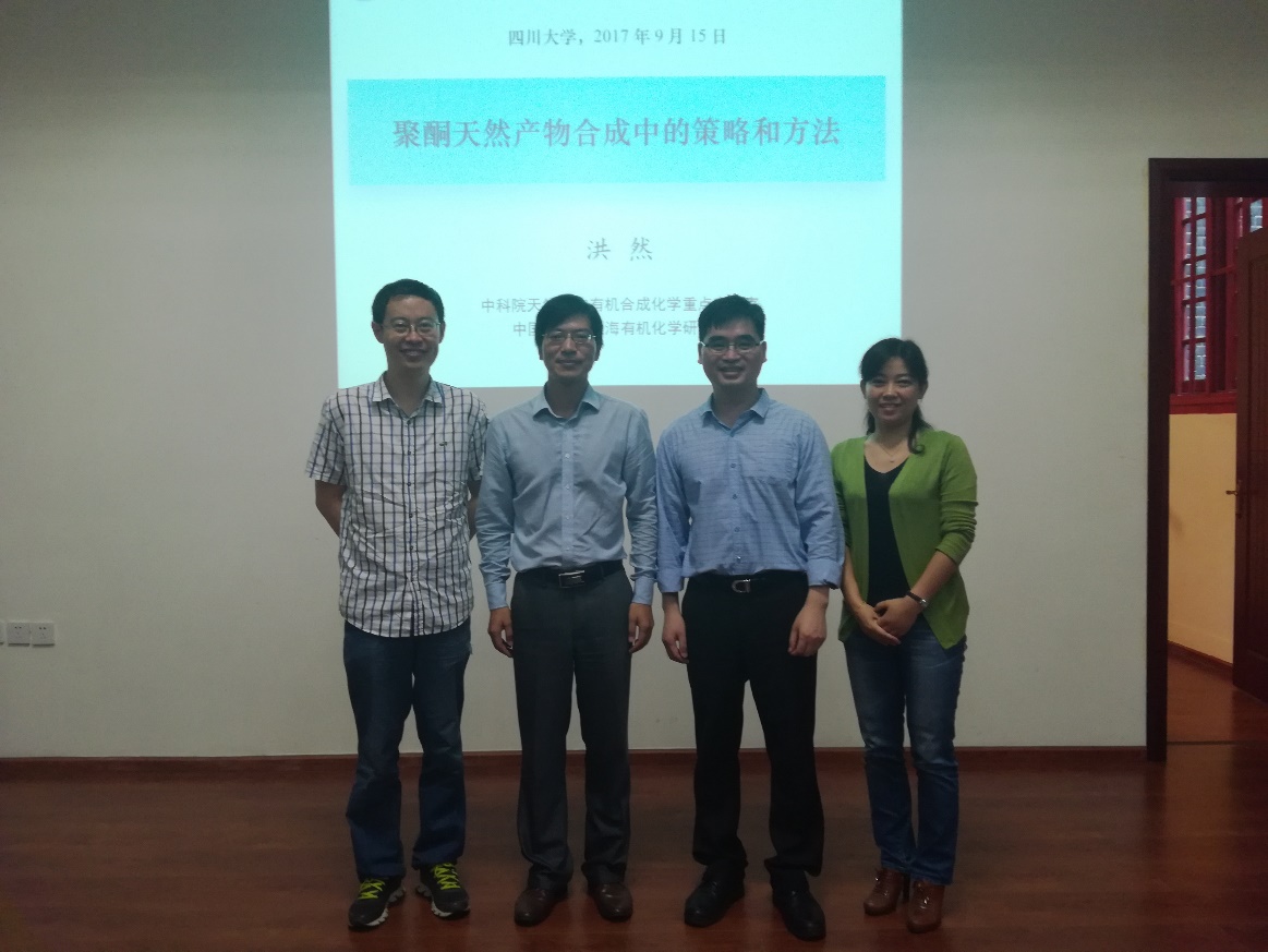 2017年9月15日上午十点半,应英国正版365官方网站邀请,中国科学院上海有机化学研究所洪然研究员来访,并作了题为“聚酮天然产物合成中的策略和方法”的学术报告。在化学馆321报告厅,洪然研究员详细介绍了该课题组仿生合成了Lankacidin antibiotics、(-)-Lasonolide A,以及通过发展新颖的 II型亚硝基环化反应完成了(±)-Kopsone全合成。此次报告会由英国正版365官方网站刘波教授主持,英国正版365官方网站数位老师及相关专业的数十名研究生参加了学术交流。洪然研究员的报告内容新颖,讲解深入浅出,激起了在座老师和同学的浓厚兴趣,报告在热烈的掌声中落下帷幕。报告结束后,洪然研究员和现场的老师、同学们进行了多方面的交流与讨论。