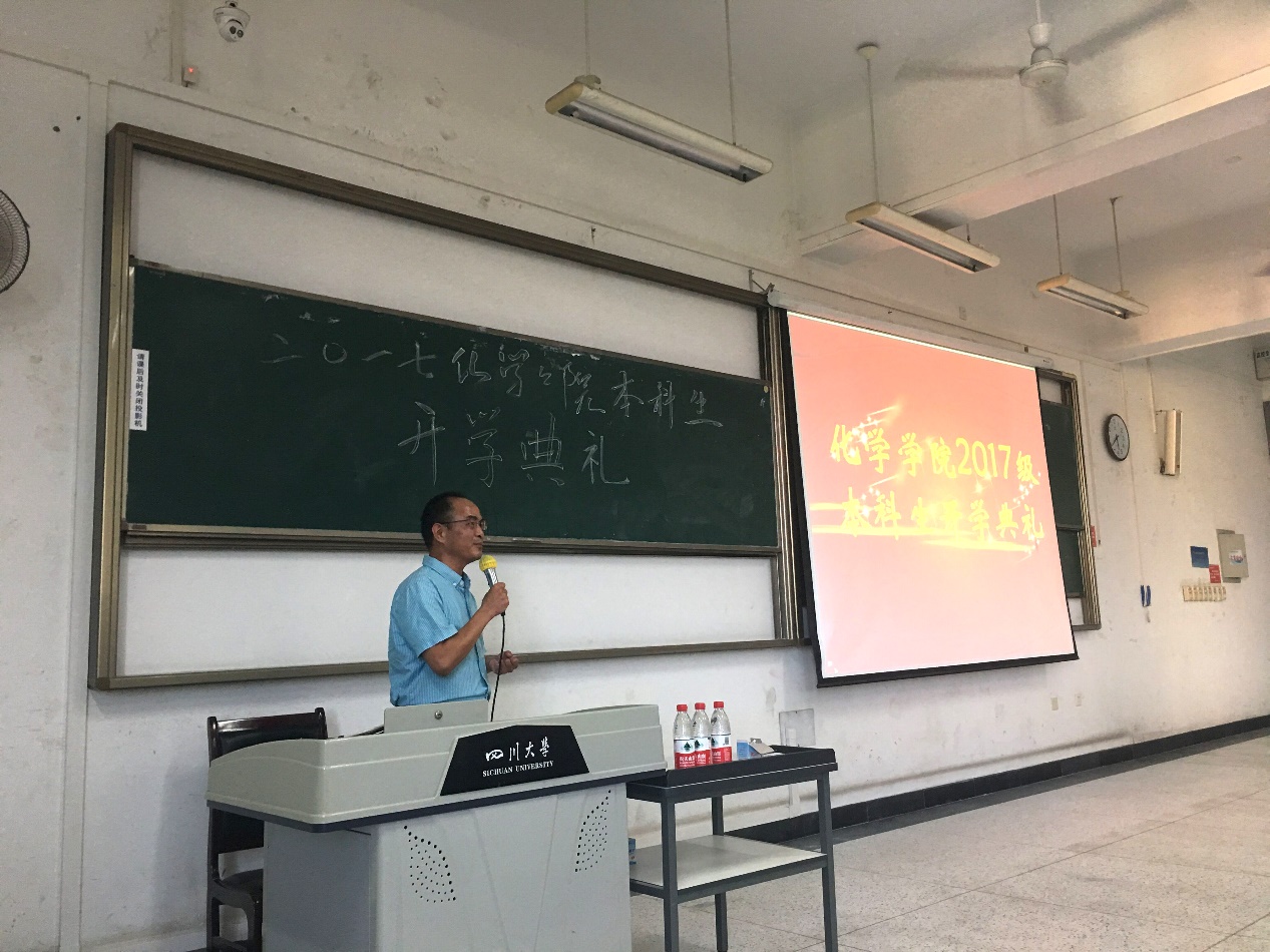 2017年9月11日下午16:00,四川大学化学学,2017级本科生开学典礼在综合楼举行。英国正版365官方网站院长游劲松教授、英国正版365官方网站党委书记王智猛老师、英国正版365官方网站教学副院长李梦龙教授、英国正版365官方网站郑成斌教授、英国正版365官方网站党委副书记谢均老师,教导员郭明秀老师、2017级辅导员杨琴老师、2017级辅导员田俊老师参加了此次开学典礼。