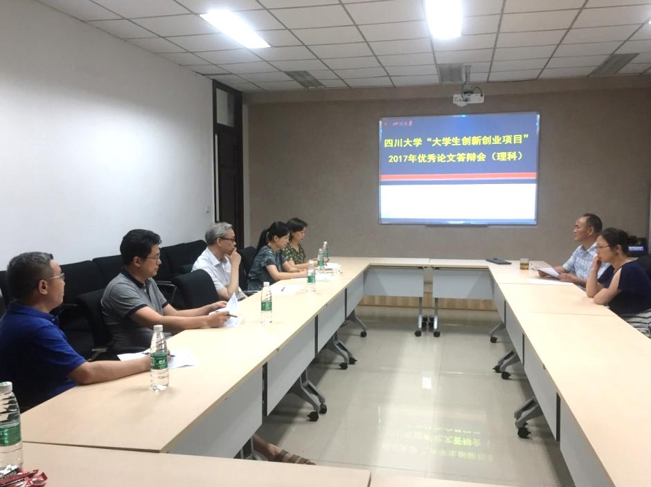 7月4日上午14:30,2017年四川大学大学生创新创业学术论坛(理科)于望江校区化学馆122顺利举行。本次论坛由教学院长李梦龙教授主持,英国正版365官方网站承办,论坛由优秀论文答辩和优秀项目评审两个部分组成。本次论坛活动特别邀请了数学学院谭友军教授、物理科学与技术学院高福华教授、英国正版365官方网站周翠松副教授、生命科学学院冯红教授、电子信息学院吴晓红副教授来担任此次评委。