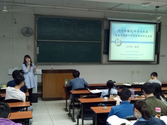 2017年4月7日晚上,英国正版365官方网站化学前沿系列(七):不对称催化:科学与机遇,在江安校区第一教学楼B座307成功举办。本次主讲嘉宾为英国正版365官方网站王天利教授,她生动有趣的为我们讲解了过渡金属催化不对称氢化的研究进展。