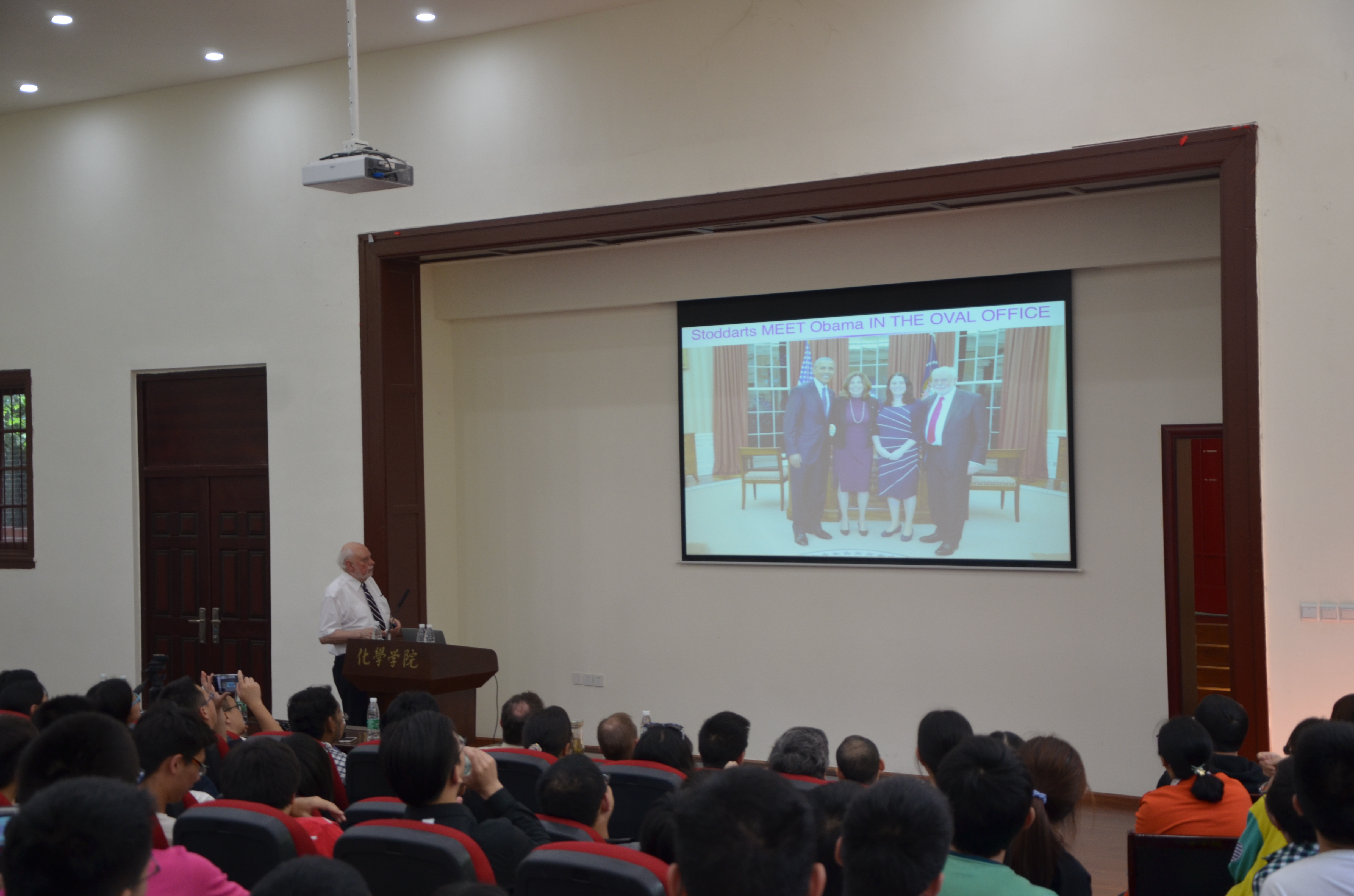 座谈结束后,Stoddart教授在化学馆321学术报告厅为全院师生做报告,报告由英国正版365官方网站院长余孝其教授主持。共300余人参加了此次报告会,321学术报告厅座无虚席,很多来自其他学院的师生也早早赶来希望一睹诺奖得主的风采,整场报告在321学术报告厅门外的大屏幕上进行了现场直播。Stoddart教授用风趣轻松的语言为师生们介绍了自己的科研成果及人生经历,向大家展现出这位在全世界范围内颇具影响力的科学家不一样的一面。首先,Stoddart教授介绍了非共价互锁超分子结构的相关知识,并深入介绍了超分子化学、机械互锁结构、轮烷、索烃和分子节的发展历史,通过PPT展示了非共价互锁超分子结构的设计与合成及这些有趣的结构在分子开关和分子机器等领域的应用。在报告中,Stoddart教授重点强调了这些分子机器的最新研究动态、进展及未来的发展前景。接着,Stoddart教授与观众分享了自己的人生经历,将自己生活中的点滴及人生道路上的关键场景融入报告,并与师生探讨自己对于音乐及美术的理解。报告快结束时,Stoddart教授还谈到了创造力的来源问题,并鼓励在座师生始终坚持自己的科研兴趣,不要跟随大流。整场报告气氛轻松幽默,时不时迸发出欢声笑语和热烈的掌声。