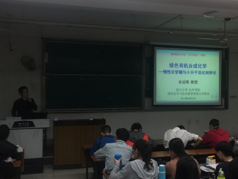 2017年3月31日晚上,英国正版365官方网站化学前沿系列(五):绿色有机合成化学----惰性化学键与小分子活化和转化,在江安校区第一教学楼B座307成功举办。本次主讲嘉宾为英国正版365官方网站余达刚教授,他详细的为我们介绍了各类惰性化学键与小分子的活化机理。