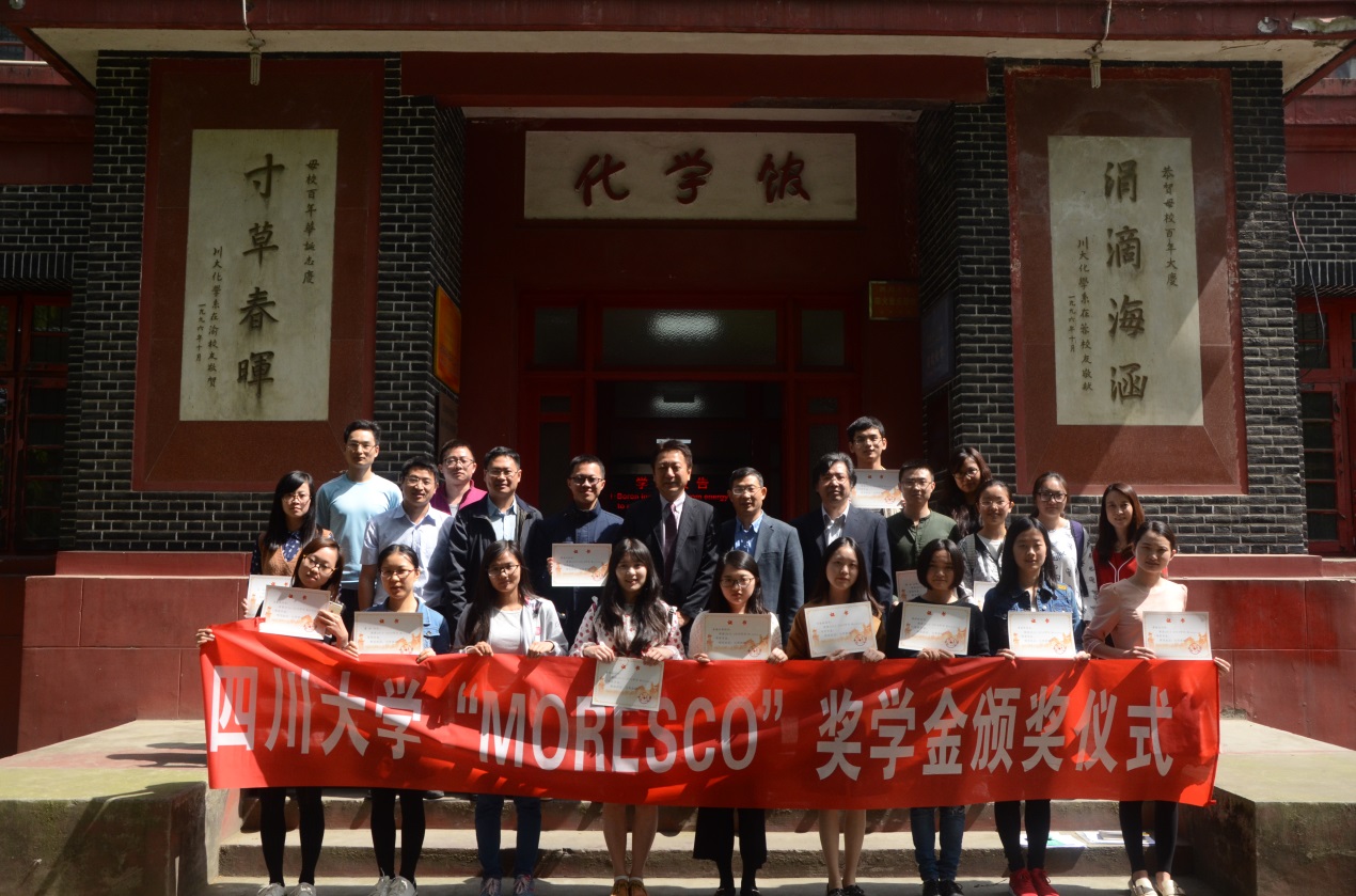 2017年4月18日上午10:00,四川大学“MORESCO”奖学金颁奖仪式在四川大学望江校区化学馆122会议室隆重举行。参加此次颁奖仪式的嘉宾有株式会社MORESCO管理本部长,上级执行役员大村洋一先生,株式会社MORESCO部长、无锡德松科技有限公司总经理刘英进先生,英国正版365官方网站院长余孝其教授,党委书记王智猛老师、党委副书记谢均老师及学生工作办公室全体老师。