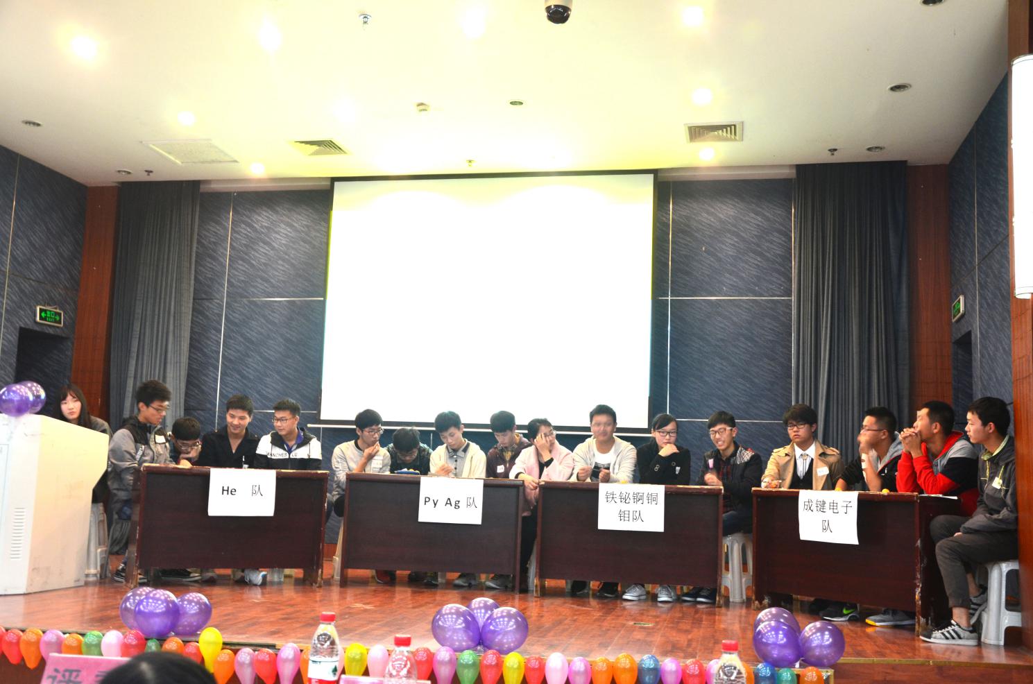 经过初赛复赛的选拔,16名来自不同学院的选手从1000多名参赛选手中脱颖而出,随机组成四支队伍:“He队”、“Py Ag队”、“铁铋锕铜钼队”和“成键电子队”。比赛首先进行的是挑战加分环节,各支队伍抽取一题,讨论后进行作答,由评委老师点评正确与否并依次评分,计算总分作为各队得分。第一轮“He队”和“铁铋锕铜钼队”表现突出,获得满分。