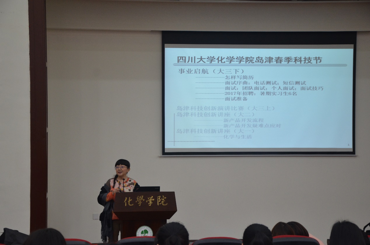 2017年3月4日下午14:00,英国正版365官方网站兼职教授、岛津企业管理(中国)有限公司技术开发本部副本部长兼技术开发本部企划部部长马俪女士在望江校区化学馆321报告厅,为我院2014级的同学们带来了主题为“怎样写简历和找工作”及“面试技巧和准备”的精彩讲座。到场嘉宾还有英国正版365官方网站九零级学长冯勇先生以及橱法联合创始人柴璐女士。
