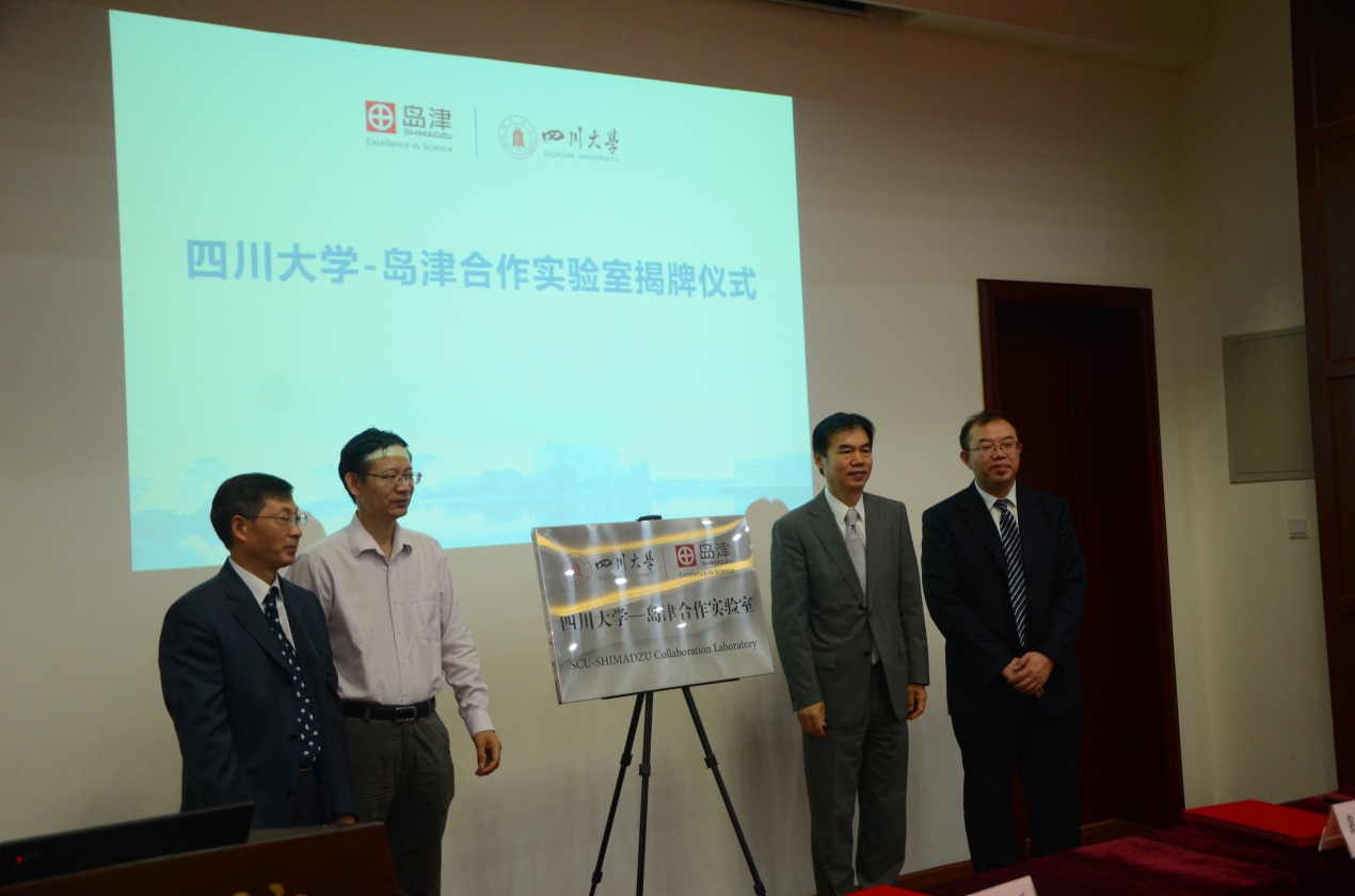 随后,游劲松副院长与岛津曹磊先生共同进行了签约仪式,预示本次合作正式达成,王瑞林副处长、余孝其院长、曹磊部长、胡家祥副部长共同为“四川大学—岛津合作实验室”揭牌。