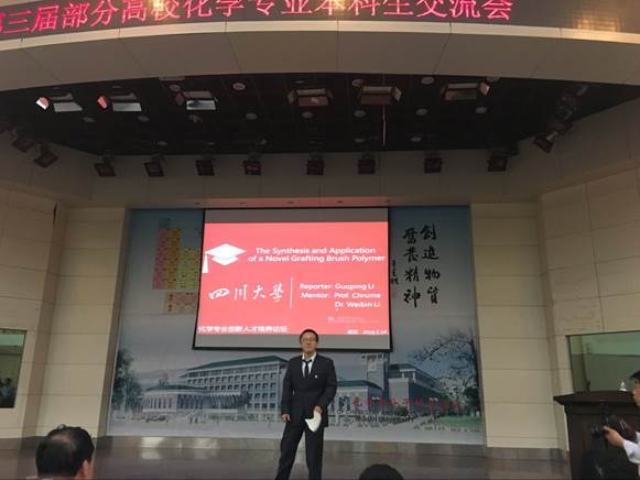 此次化学专业本科生交流会以“化学,让生活更美好”为主题,各高校选派1名本科三年级学生代表就大学生业余科研或运用化学知识解决事迹问题进行大会交流,专家评委评选出一、二、三等奖。来自南京大学、吉林大学、北京理工大学等全国21所高校的化学专业优秀本科学生参加了此次交流会。我院2013级本科学生黎郭平以“The Synthesis and Application of a Novel Grafting Brush Polymer”为题,做了全英文科研报告,并最终获得大会交流报告一等奖。