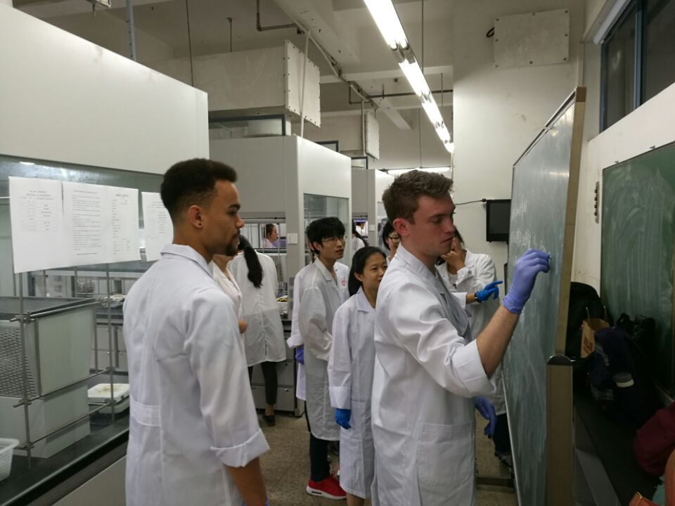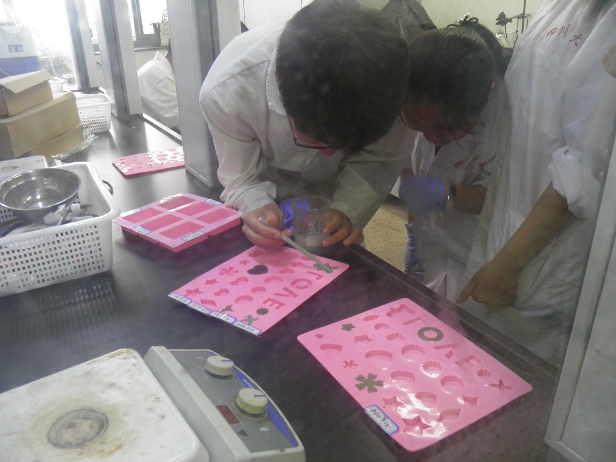 英国正版365官方网站参加国际交流营的26位同学与4位英国约克大学学生于2016年7月6日和7月7日的上午在四川大学江安校区第一基础实验楼A411实验室,完成了制备手工皂以及制作叶脉书签两个创意化学实验。