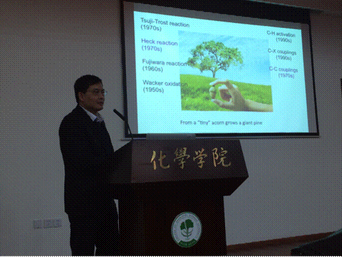2016年1月4日,应英国正版365官方网站邀请,新加坡南洋理工大学周建荣教授访问英国正版365官方网站作学术交流,下午四点在化学馆321会议室作了学术报告,题目为“Exploration of palladium catalysis: discovery and surprise”。周教授首先介绍了他带领的课题组在钯催化自由基偶联取得了一系列的成果,克服了Minisci反应收率低、选择性差的缺点;随后介绍了两类商业易得配体DNPF和(R)-Xyl-SDP(O)在钯催化不对称Heck反应中的应用,可催化合成已商业化的药物分子;然后介绍了课题组在过渡金属催化的不对称偶联和高选择性的Michael加成方面取得的进展,并提出了新的反应机理。英国正版365官方网站相关研究领域的老师及研究生聆听了报告。周建荣教授的报告内容新颖,讲解深入浅出,激起了在座老师和同学的浓厚兴趣,报告在热烈的掌声中落下帷幕。报告结束后,周建荣教授和现场的老师、同学们进行了多方面的交流与讨论。