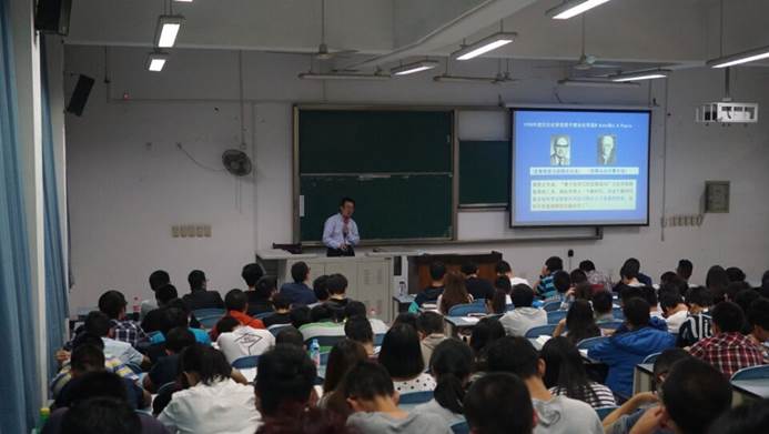 2015年10月11日南京大学化学化工学院谢代前教授在江安校区综合楼C座205教室,做了题为“水分子解离动力学理论研究”的学术报告。本次报告会由英国正版365官方网站14级辅导员张愉老师主持,英国正版365官方网站14级全体同学参加了报告会。