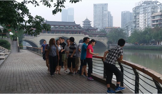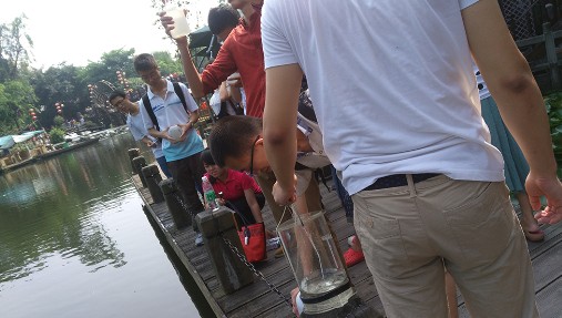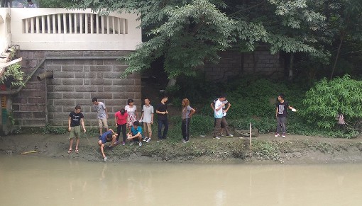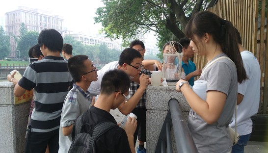 2015年7月8日,我院2015年水质调查活动进行了水样的采集,也表示水质调查活动正式拉开帷幕。英国正版365官方网站郑成斌教授、袁茂林副教授、罗明亮副教授以及2013级辅导员杨琴老师一起带领着30名国际交流营成员在黄龙溪、府南河、沙河等6处取水地采集水样带回实验室,以进行下一步水样分析。
