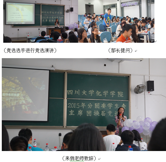 主持人介绍竞选规则后,精彩激烈的竞选演讲正式开始。由团委副书记的竞选到学生会副主席的竞选,每位同学的演讲都饱含激情、展示了自己的雄心壮志。视频、PPT都让在场的老师宾及同学感受到了选手们的用心,各位选手都对未来的工作进行了设想,各有亮点,分析到位。曾泽安同学在演讲后演唱一段《年轻的战场》为自己成功拉票,也舒缓了大家紧绷的神经。在每位同学演讲结束后的充满紧张气氛的提问环节,主席部长们根据大家的工作设想逐步分析,抓住要点提出问题,也向我们展示了团委学生会在建设过程中对待问题的严谨与全面分析。