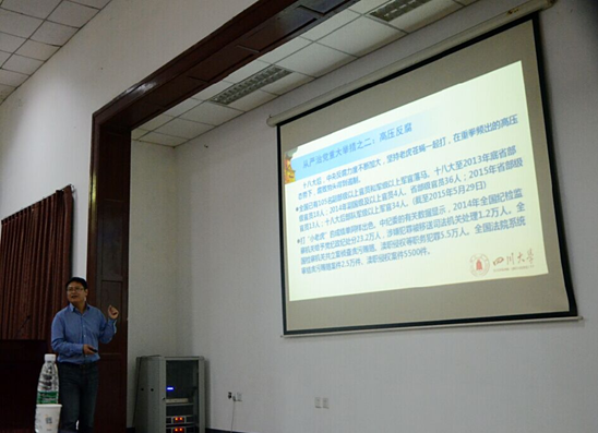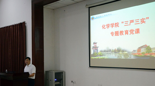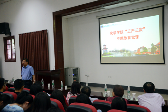 5月29日下午,英国正版365官方网站 “三严三实”专题教育党课报告会在化学馆一楼报告厅举行。党委书记王智猛做了“践行三严三实,做一名忠诚干净担当的党员干部”的专题教育党课。报告会由余孝其院长主持,校党委书记杨泉明教授、校长助理组织部部长曹萍教授等到报告会现场给予指导。英国正版365官方网站班子成员、教职工党支部书记、民主党派代表、教师党员代表、退休党员代表以及学生党员干部参加了报告会。