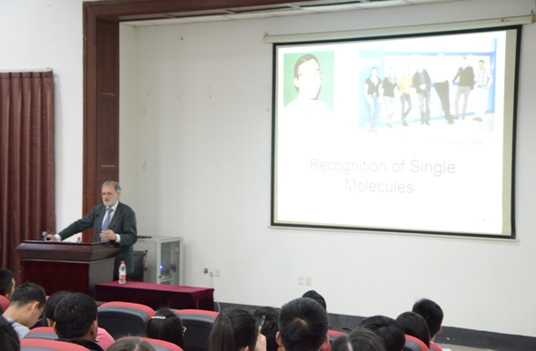 2015年04月13日,德国萨尔布吕肯大学(Saarland University)Gerhard Wenz教授应英国正版365官方网站杨成教授邀请来英国正版365官方网站访问,并在化学馆321作了题为“Smart Materials from Cyclodextrins”的精彩学术报告,报告由杨成教授主持,英国正版365官方网站袁立华、高戈、Jason Cruma等教授及相关专业的研究生参加了此次报告。报告中,Gerhard Wenz教授就该课题组在环糊精领域的重要研究成果做了详细的讲解。报告内容丰富,Gerhard Wenz教授讲解深入浅出,激起了在座老师和同学的浓厚兴趣,报告在热烈的掌声中落下帷幕。报告结束后,Wenz教授与学院部分师生进行了激烈的讨论。
