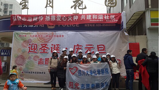 冬日的寒冷抵不住心中的热情,为了使小区居民密切交流,增进感情,双流青少年工作协会联合英国正版365官方网站“阳光”青年志愿者服务队于2014年12月14日上午在成都双流西航港星月社区开展了“迎圣诞•庆元旦志愿者风采展示”活动。