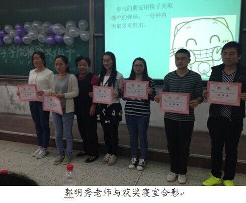 在综合各寝室的布置与才艺展示后,最终女生寝室9-8-302夺得桂冠。郭明秀老师与杨琴老师为获奖寝室颁奖并与他们合影留念。活动在欢乐和谐的氛围中画上了圆满的句号。