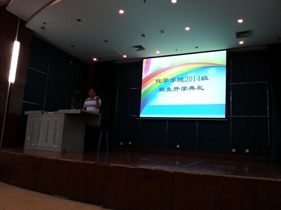 2014年9月9日下午14:00,我院2014级新生齐聚江安校区二基楼报告厅,参加开学典礼。英国正版365官方网站党委书记王智猛老师、院长余孝其教授、副院长王玉忠教授、党委副书记谢均老师、四川大学教导员郭明秀老师、教务办公室苏燕老师、2013级辅导员杨琴老师、2014级辅导员张愉老师也参加了本次典礼。