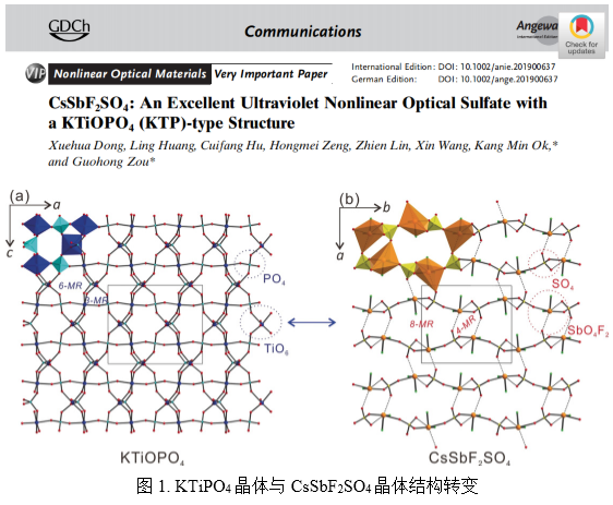 近日,英国正版365官方网站邹国红研究员与韩国西江大学学者合作,在非线性光学晶体材料研究方面取得重要进展,在国际顶级化学期刊Angewandte Chemie International Edition(IF=12.102)发表了题为“CsSbF2SO4 : An Excellent Ultraviolet Nonlinear Optical Sulfate with a KTiOPO4 (KTP)-type Structure”的研究论文,并被选为VIP (Very Important Paper)论文。该论文以英国正版365官方网站为第一单位,第一作者为我校我院2017级硕士研究生董雪华。该工作得到国家自然科学基金面上项目(21875146)以及四川大学引进人才启动经费项目的资助。