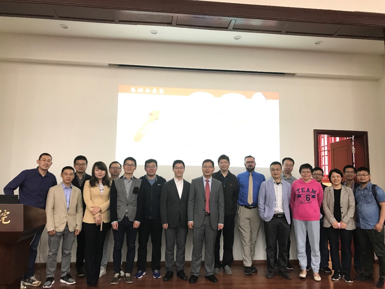 在报告中,赵军锋教授重点介绍了他们课题组发现的可用于构建酰胺键的炔酰胺类化合物及其应用,通过该炔酰胺类化合物可以实现酰胺键、酯键等的高效构建。他首先介绍了酰胺键的构建在蛋白质合成方面的重要意义,随后详细的介绍了他们发现炔酰胺类化合物的过程,在此基础上他们发展了炔酰胺介导的“两步一锅”酰胺键构建和酯键形成方法。此外他还介绍了该炔酰胺类缩合剂在硫肽的合成、天然产物全合成和复杂多环分子的高效合成方面的应用,并对该缩合剂的潜在应用前景做了详细的描述,体现了该研究的重要科学意义。整场报告内容丰富,赵军锋教授讲解思路清晰,由浅入深,形象生动地向我们展示了他们课题组近期的工作,在座的师生全神贯注、兴趣盎然。在随后的自由提问环节,在座师生与赵军锋教授进行了深入地讨论交流,大家都表示获益匪浅。报告在全场师生热烈的掌声中落下了帷幕,结束后部分老师与赵军锋教授进行了合影留念。