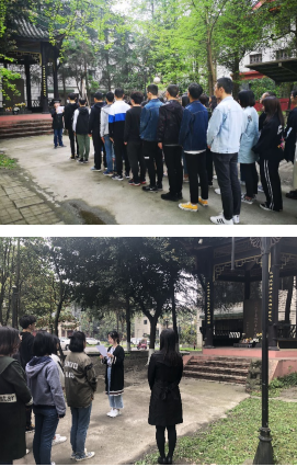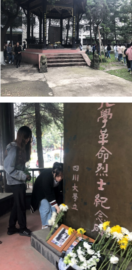 全体高唱《中华人民共和国国歌》后,谢均副书记为大家介绍了革命烈士纪念碑,并鼓励大家要继续继承和弘扬伟大的民族主义精神和爱国主义精神,在今后的学习工作中更好的发挥先锋模范作用。预备党员代表成锐、张鑫同学与大家分享了张培爵、江竹筠先烈的生平事迹,让同学们对爱国主义、民族精神有了更深刻的认识。随后全体老师和同学还高唱共青团歌,怀揣着对革命烈士的敬仰之情,深深鞠躬,瞻仰纪念碑并献上鲜花,表达了对革命先辈的崇敬和哀思之情。