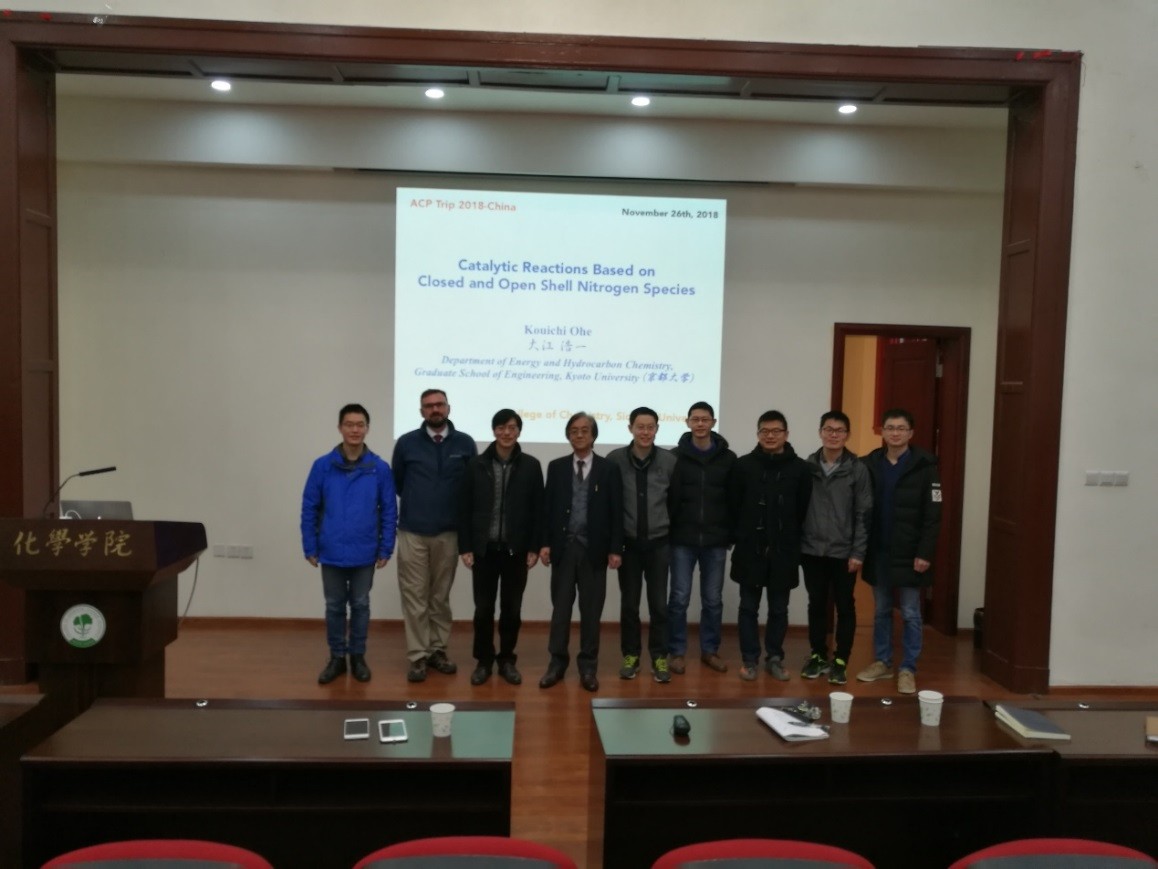 2018年11月26日上午10:30,应英国正版365官方网站邀请,日本京都大学Kouichi Ohe教授访问我院,并在化学馆321报告厅做了题为“Catalytic Reactions Based on Closed and Open Shell Nitrogen Species”的学术报告。Kouichi Ohe教授首先介绍了氮宾化学及其在不对称合成2H-Azirine中的应用,随后介绍了他们团队对铁催化的分子内酮亚胺的氨基氯化反应和环加成反应的相关研究进展。报告内容丰富,引起师生们广泛兴趣。报告后,在场师生与Kouichi Ohe教授进行了热烈而深入的交流和讨论。