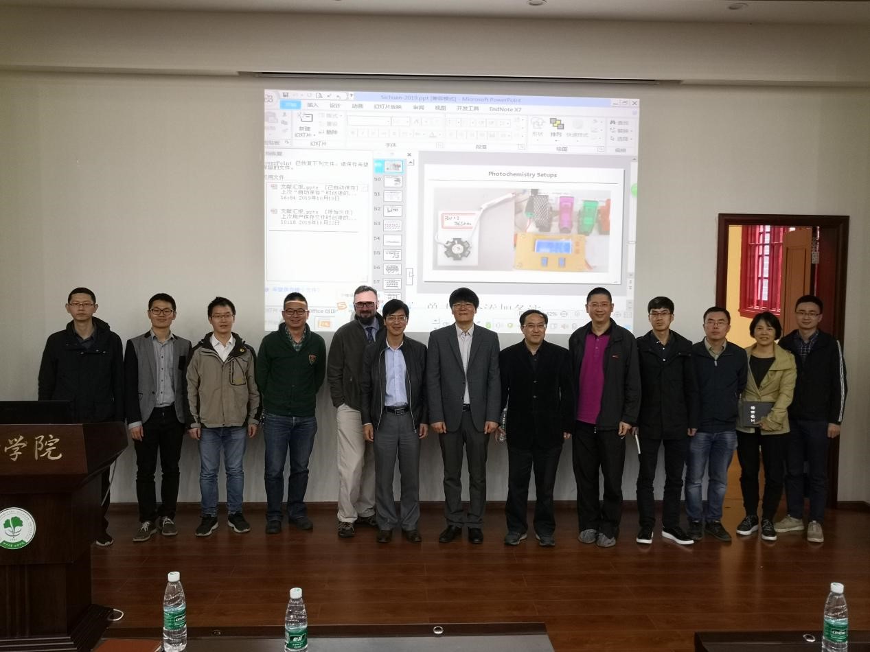 Oh教授首先介绍了他在美国印第安纳大学-普渡大学工作时利用铜和手性配体催化亚胺酸酯的不对称[3+2]环加成反应;第二部分介绍了他在韩国中央大学工作期间,系统性地发展了利用β-氯代不饱和酮化合物构建各种五元/六元杂环化合物的新颖方法学。Oh教授的报告内容新颖,讲解深入浅出,激起了在座老师和同学的浓厚兴趣。报告结束后,Oh教授和现场的老师、同学们进行了深入的交流与讨论。