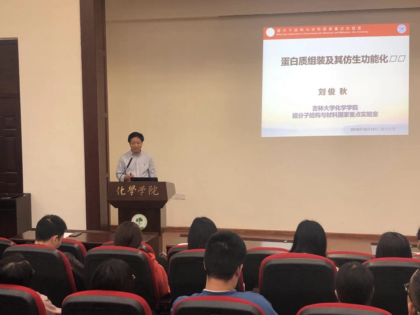 2019年10月15日下午14:30,应英国正版365官方网站邀请,吉林大学刘俊秋教授访问我院,并在化学馆321报告厅做了题为“蛋白质组装及其仿生功能化”的学术报告。此次报告由英国正版365官方网站李坤教授主持,张骥教授、陈善勇副教授和刘艳红等老师及学生参加了此次报告。