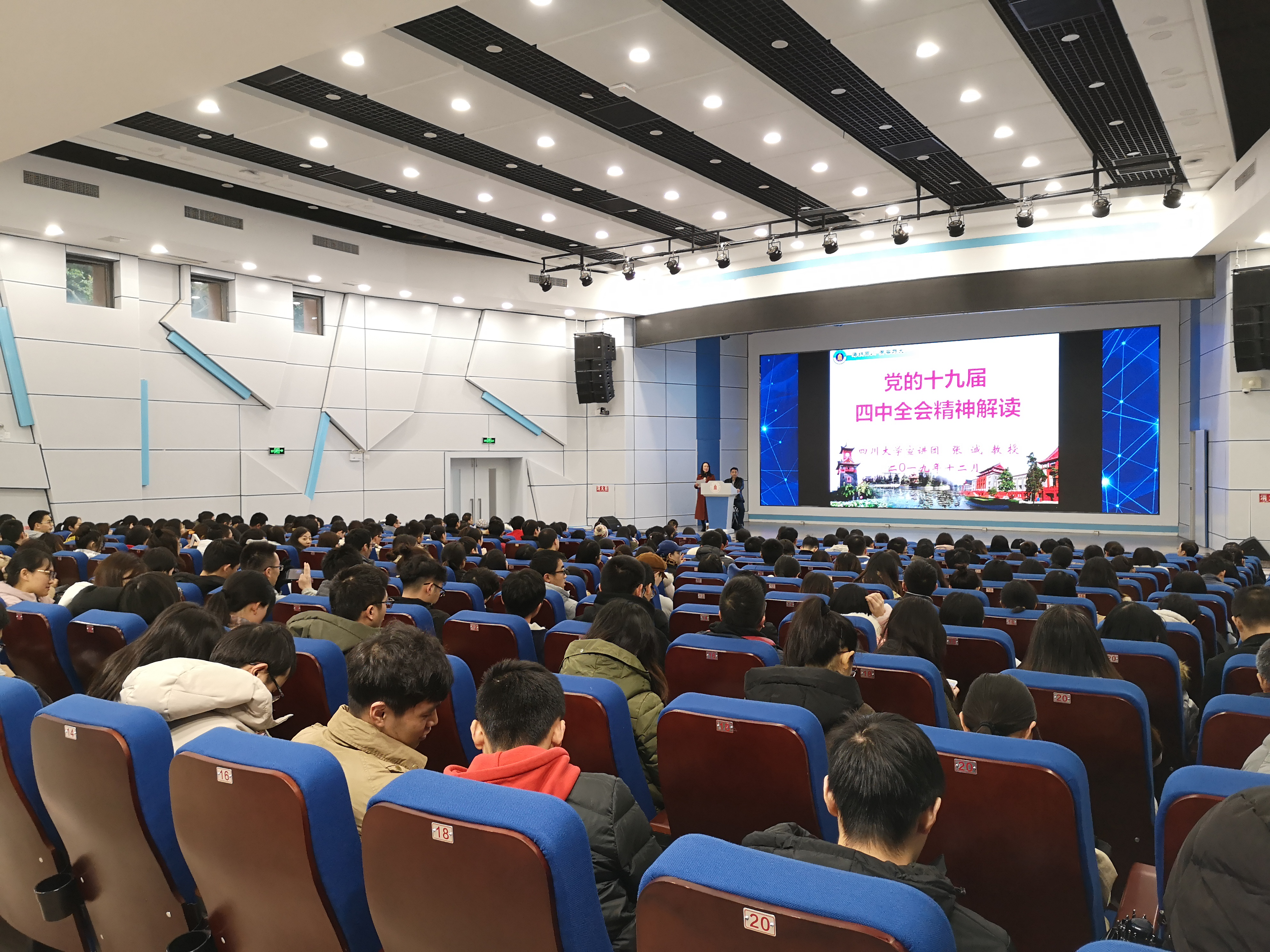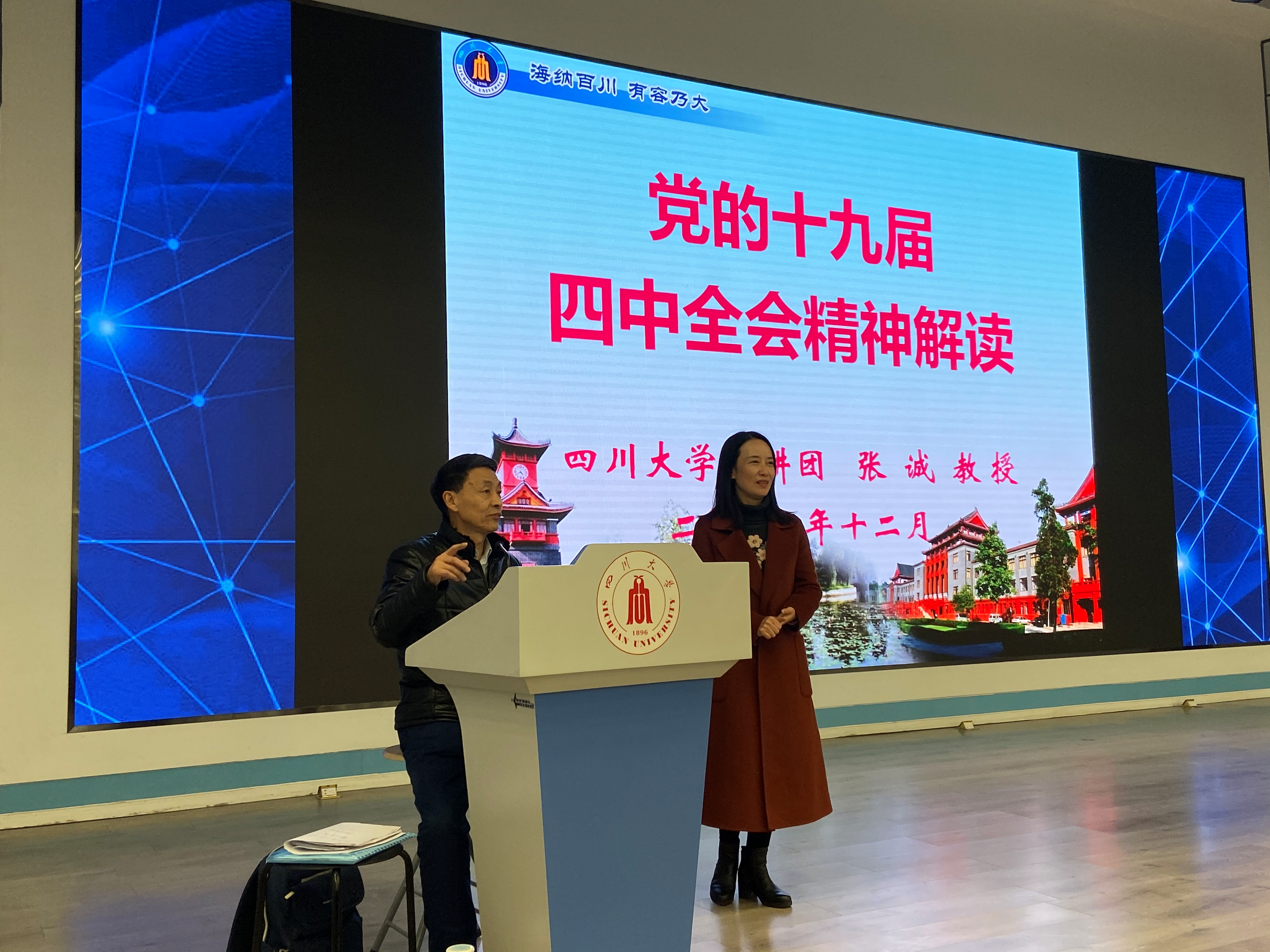 2019年12月20日下午,英国正版365官方网站在望江校区东三教演播厅举行“党的十九届四中全会精神宣讲报告会”,特邀学校宣讲团专家张诚教授主讲。报告会由学院党委副书记谢均同志主持,学院领导班子成员和师生职工党员300余人参加了宣讲报告会。