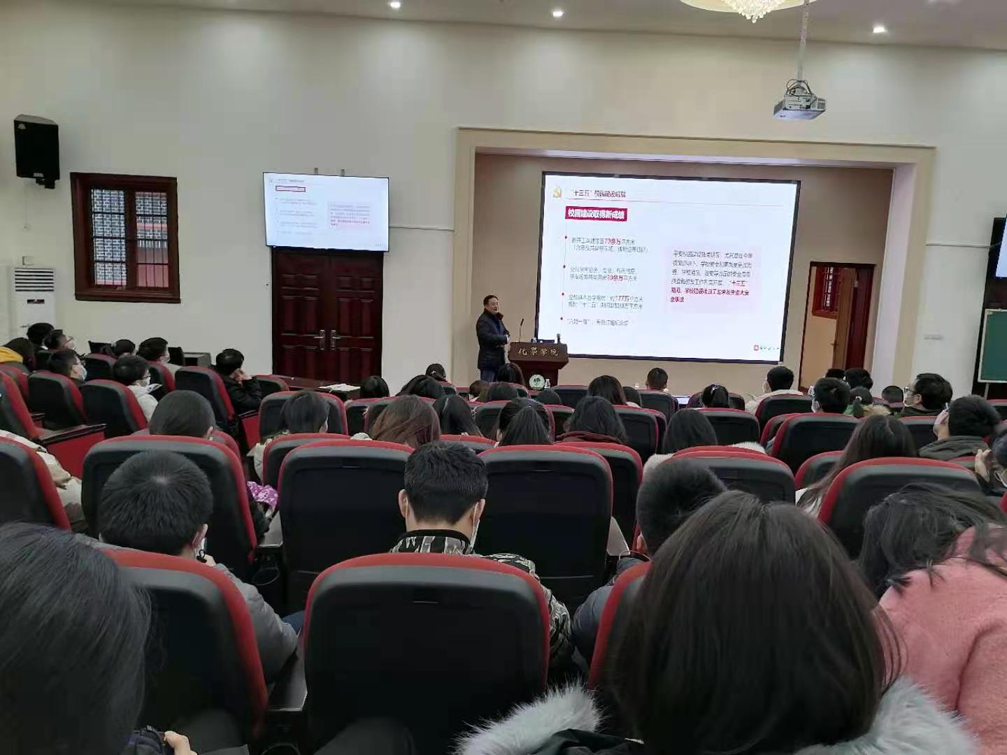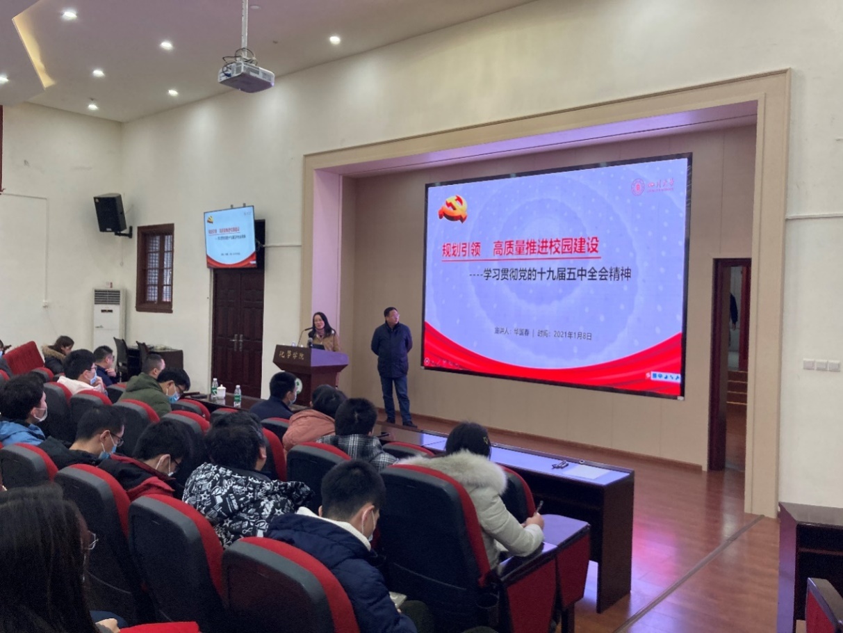 为深入学习贯彻党的十九届五中全会精神,领会十四五规划的科学内涵,全面加快推进我校“两个伟大”奋斗目标,在两个一百年交汇之际以更好的成绩献礼建党100周年。2021年1月8日下午14:30,在化学馆321报告厅,我院邀请了学校十九届五中全会精神宣讲团成员、基建处华国春处长,为我院全体党员师生开展了题为《规划引领,高质量推进校园建设—学习贯彻党的十九届五中全会精神》的报告会。