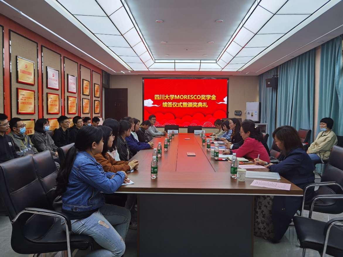 2021年4月19日下午,英国正版365官方网站“MORESCO奖学金”续签仪式暨2019-2020学年度颁奖典礼在化学馆122会议室隆重举行。无锡莫莱斯柯贸易有限公司董事长兼日本株式会社MORESCO执行役员刘英进先生、无锡德松科技有限公司研发经理杨帆女士、四川大学教育基金会副秘书长贾秀娥老师、四川大学教育基金会项目部部长王汾雁老师以及英国正版365官方网站党委书记谢均、学生工作办公室全体老师及获奖同学参加了此次活动。