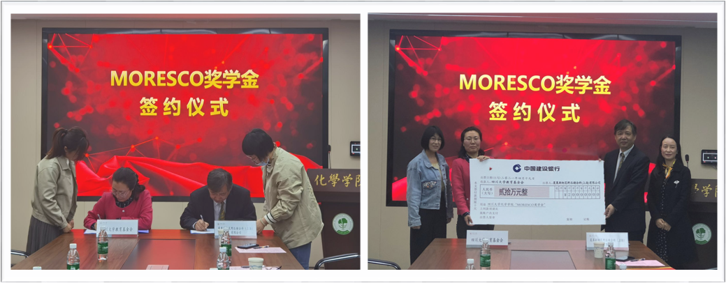 续签仪式后进行了隆重的颁奖典礼,同学们一一表达了对MORESCO公司的感谢,并对培养自己的学校学院和老师们表示感激,同时表示以后一定会再接再厉,继续认真完成自己的学业,毕业后为社会贡献力量。颁奖典礼在热烈的掌声中圆满结束,到场嘉宾在化学馆门口与获奖同学进行了合影留念。