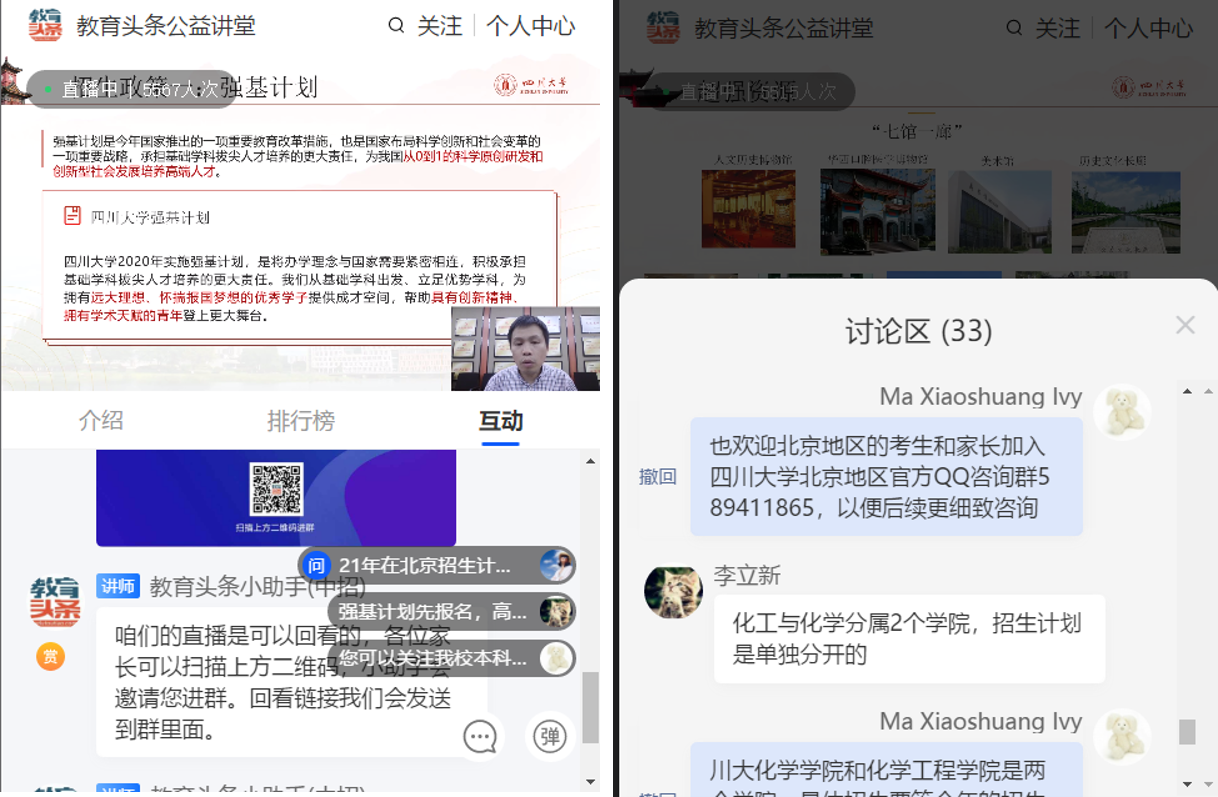 当晚20:00,郑成斌教授在化学馆122会议室开启了招生宣讲直播,从四川大学的历史底蕴、学科实力、教学科研条件、学生就业深造等方面向考生和家长展示了“厚通识、宽视野、多交叉”的本科教育特色和丰富多彩的校园生活,并详细介绍了2021年川大的招生政策,鼓励考生积极报考。宣讲期间,考生及家长在提问区踊跃提问,问题集中在川大优势专业、往年分专业录取情况、专业调剂、强基计划、拔尖计划、中外合作办学等方面,我院及匹兹堡学院招生宣传组的老师一一答疑,加深考生和家长对川大的了解。一个小时的宣讲和答疑似乎不能满足考生和家长深入了解川大的需求,于是我们邀请大家加入四川大学对北京地区本科招生咨询QQ群,方便考生和家长后续咨询。