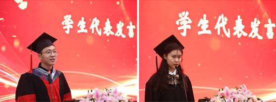 博士生代表石磊同学、本科生代表王梦欣同学分享了自己在化院学习、科研的感悟,并代表全体毕业生向培育同学们成长进步的老师们表达了由衷的感谢和真挚的祝福。
