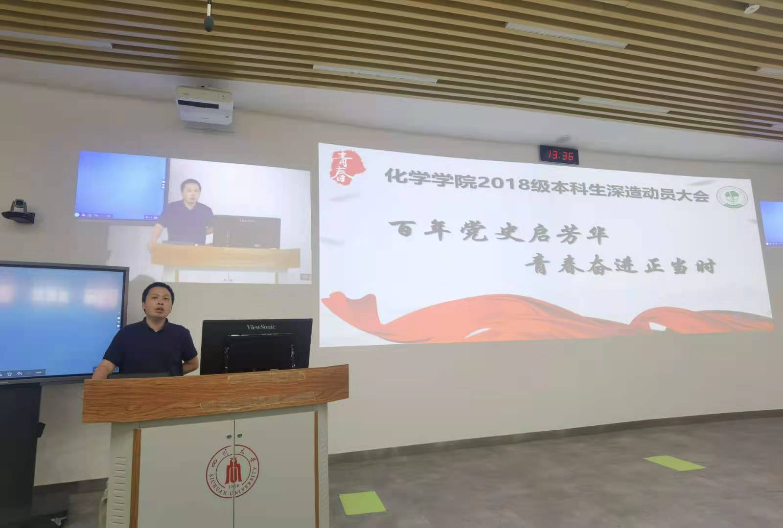 在庆祝中国共产党成立100周年之际,为进一步引导学生树立远大人生目标,助力学子明确深造方向、科学合理备战,四川大学化学学院于2021年7月2日下午在望江基础教学楼C201教室举行了“百年党史启芳华,青春奋进正当时”——2018级本科生深造动员大会。学院党委书记谢均老师、学院副院长郑成斌教授、2017级优秀本科生代表及2018级全体本科生参加了本次活动,2018级本科辅导员张若一老师主持大会。