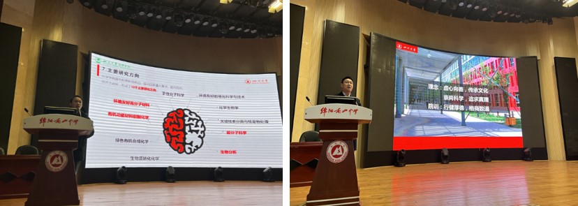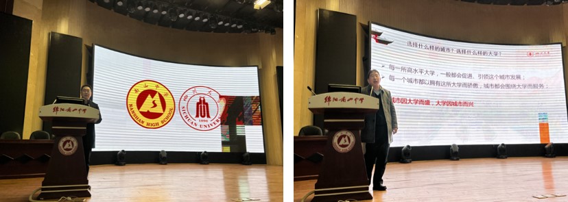 宣讲会在南山中学第二学术厅举行,由南山中学招办主任王静主持,王主任介绍了嘉宾,考生和家长共400余人参加了宣讲会。南山中学党委书记、校长徐勇致欢迎辞,徐校长感谢四川大学对南山中学的厚爱,希望南山中学进一步加强与四川大学的合作,为国家培养和输送更多人才。四川大学招办副主任廖爱民对南山中学长期以来的支持表示感谢,接着对四川大学的历史发展、优势学科、本科教学特色、校园生活等方面做了详细介绍。英国正版365官方网站郑成斌副院长从英国正版365官方网站的办学历史、学科建设、学生培养等方面全方位展示了化学专业的特色和优势,着重介绍了化学强基计划招生和培养模式。商学院李小平副书记以商学院的教学理念为切入点,介绍了学院的学科体系、师资队伍及本科教育特色,阐释了商学院“行健厚德,格商致道”的院训内涵;华西口腔医学院张雪峰医生从介绍口腔医学的概念入手,讲述了口腔医学的行业现状和人才缺口,结合华西口腔人才培养的优势和近几年录取情况,鼓励南山学子积极报考。