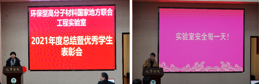 2022年1月21日上午我院环保型高分子材料国家地方联合工程实验室于化学馆321报告厅举行了年度工作总结暨表彰大会。会议由环保实验室党支部书记汪秀丽教授主持,实验室全体师生参加了此次大会。