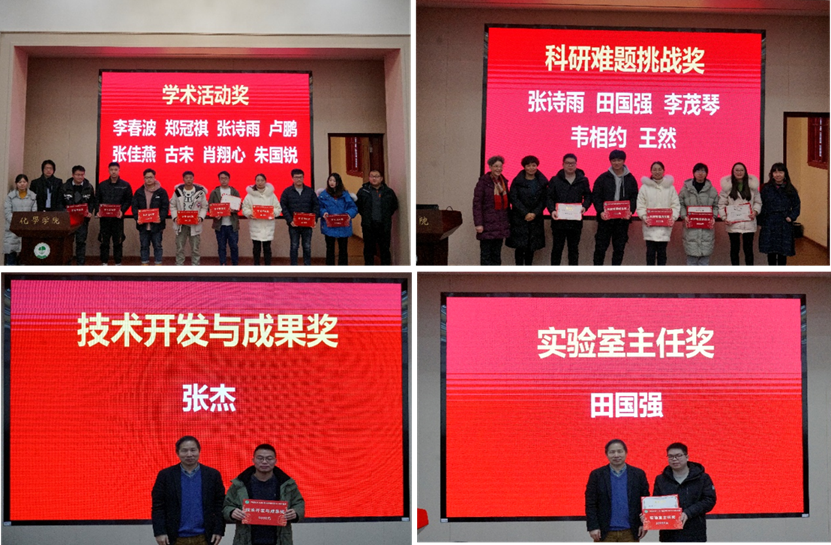总结会后进行了隆重的颁奖仪式,除了实验室奖励条例中规定的“好师兄/师姐奖”、“优秀本科生奖”在暑期期末评选颁奖外,其他单项奖都在本学期期末评选和颁奖。 实验室副主任吴刚教授宣读了2021年度获得实验室各单项奖获奖人员名单,包括:优秀进展报告奖、学术活动奖、技术开发与成果奖、科研难题挑战奖、公益活动优秀奖、文体活动优秀奖以及实验室主任奖共7项,总计有107人次(61人)获得了各项奖励。在热烈的掌声和激昂的音乐中,实验室各位老师为获奖同学颁发了荣誉证书,并鼓励大家继续努力,向优秀同学看齐,共同为实验室的进步付出自己的一份力。